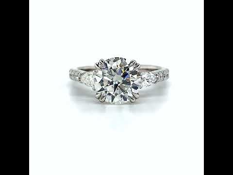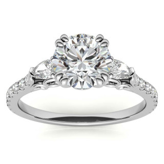 Embrace the enchanting allure of our exquisite cathedral engagement ring, meticulously crafted to captivate hearts with its striking design. The centerpiece of this stunning ring is a round brilliant Moissanite, carefully selected in the size and quality that resonates with your preferences. Flanking the center stone, two pear cut Moissanite side stones measuring 4x2mm/0.12ct each, complete the mesmerizing three-stone motif.