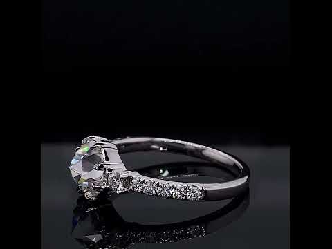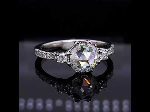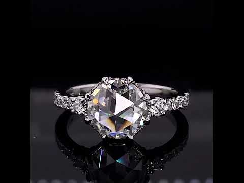 Immerse yourself in the enchanting design of our captivating engagement ring, meticulously crafted to capture the essence of a bygone era. The low-set design boasts a truly unique 8-prong setting, embracing a mesmerizing rose-cut round brilliant Moissanite center stone of your preferred size, evoking the charm of days gone by with its antique motif.