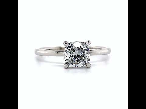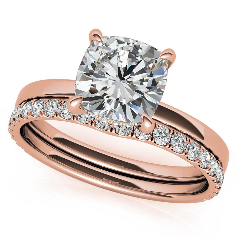 This beautiful Moissanite engagement ring features a petite 1.7mm band width with a cushion cut colorless Moissanite center stone and 0.03ct - 0.06ct of colorless Moissanite side stones, and is cast in your choice of 14k gold, 18k gold or platinum. Add the optional 0.36ct matching band to make this a complete set.