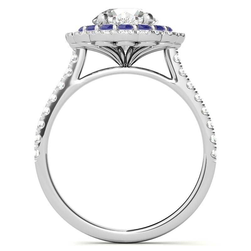 The outer halo is studded with colorless Moissanite stones, while the inner halo, adorned with slightly larger gemstones, can be customized with either rubies or blue sapphires, creating an alluring two-toned effect. The total carat weight of the accentuating side stones ranges between 0.61ct - 0.76ct, depending on the center stone size chosen.