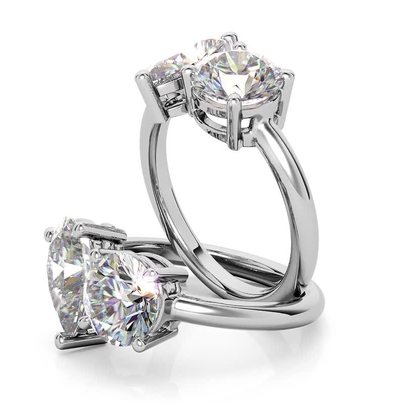 When selecting your round brilliant Moissanite, each option is matched with the perfect oval cut Moissanite accent stone. A 5.5mm/0.66ct round brilliant is paired with an 8x5mm/1ct pear cut accent. A 6.5mm/1ct round brilliant is paired with a 9x6mm/1.5ct pear cut accent, while a 7.5mm/1.5ct round is paired with a 10x7mm/2ct accent. If you choose an 8.5mm/2.5ct round, the accenting pear will be 11x7.5mm/3.0ct.