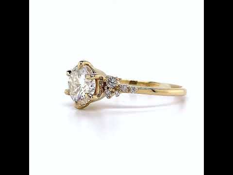 Experience the allure of this stunning engagement ring that showcases a captivating cluster design. Crafted with precision, this masterpiece features a round brilliant Moissanite center stone that is securely held in place with six exquisite claw-shaped prongs.