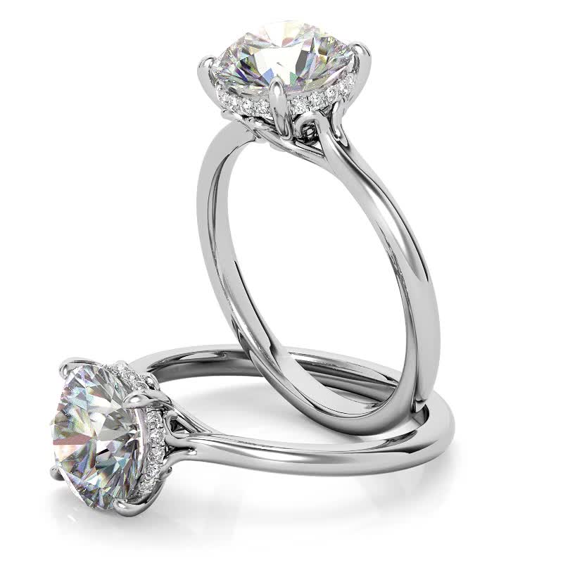 The sides of the center stone are adorned with a hidden halo aesthetic, featuring delicate Moissanite melee stones encircling the center stone, with a total weight ranging from 0.05ct to 0.11ct.