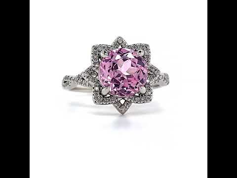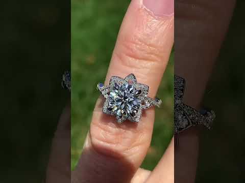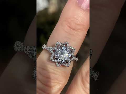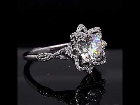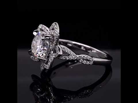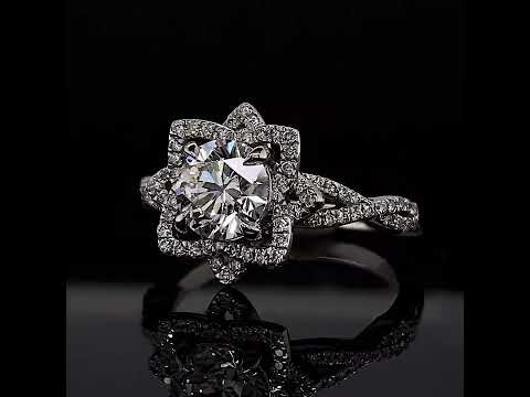 Behold a stunning engagement ring designed with an exquisite lotus-shaped halo encircling a round brilliant Moissanite center stone, complemented by a beautifully twisted infinity-style band.