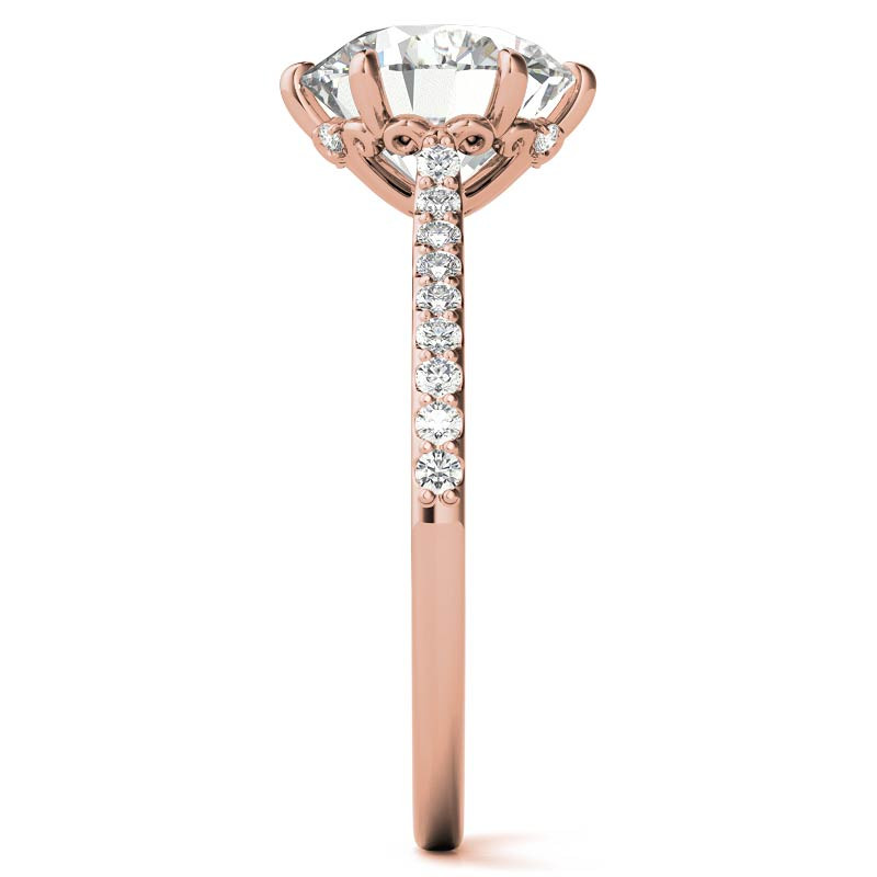 The round brilliant Moissanite center stone sits gracefully atop the setting, accentuated by 0.20ct of colorless Moissanite side stones that add to the ring's overall brilliance.