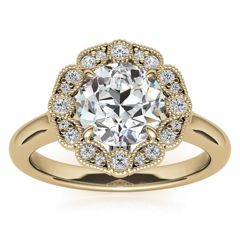 This is an exquisite engagement ring that boasts a magnificent antique motif. The milgrain accented halo is shaped with a scalloped design, and its stunning allure is heightened by the addition of 0.22ct - 0.24ct accent Moissanite stones.