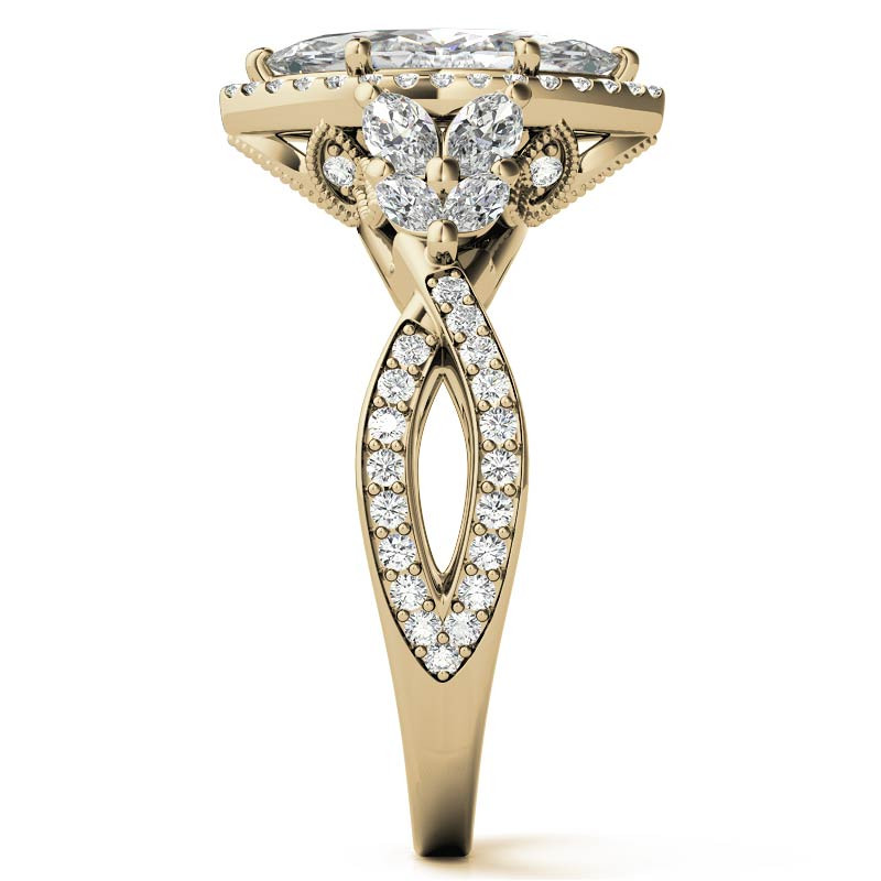 At the heart of this masterpiece lies a marquise cut Moissanite gemstone, chosen according to your desired size and quality. Admire its resplendent beauty, surrounded by a captivating halo of round melee accent stones that gracefully adorn the split portion of the band. Unveiling another layer of sophistication, delicate milgrain-detailed petal-shaped accents enhance the area beneath the center stone, infusing the design with a delightful floral motif.
