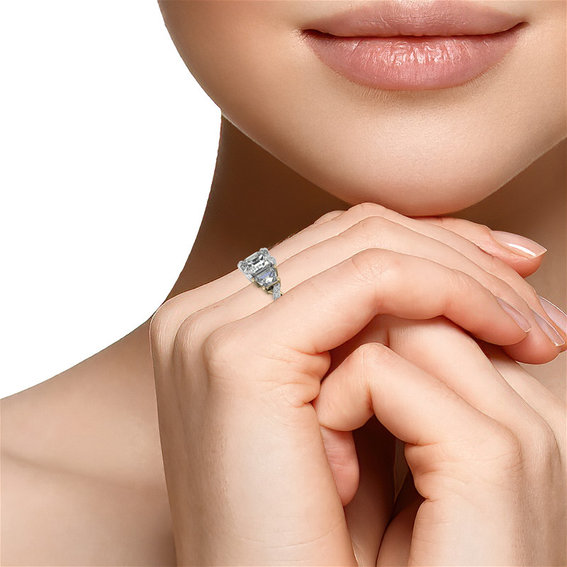 This stunning engagement ring boasts a striking three stone design with a magnificent asscher cut Moissanite center stone, available in a range of sizes to suit your preference.