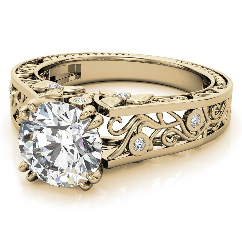 The side stones of the ring are just as beautiful, with 0.10ct of round diamond, colorless Moissanite, or blue sapphire accentuating the beauty of the center stone. The delicate floral design on the sides of the band features floral and scroll motifs, as well as milgrain accents, making the ring truly unique and unforgettable.