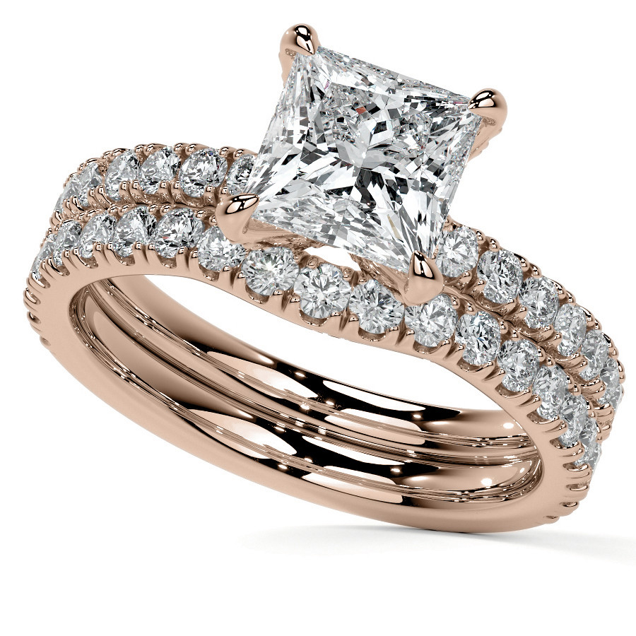This stunning ring features an intricately accented band and four claw prongs, which securely hold a breathtaking princess cut Moissanite center stone that can be customized to your desired size.