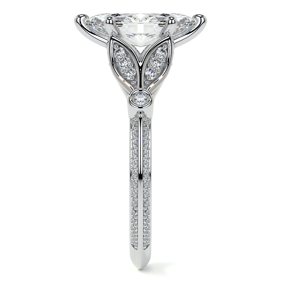 This stunning cathedral engagement ring boasts a nature-inspired floral motif with petal-shaped designs adorning the top of a split shank band. The center stone is a beautiful marquise-cut Moissanite gemstone which can be tailored to your desired size and quality, delicately held in place by six unique claw-shaped prongs.