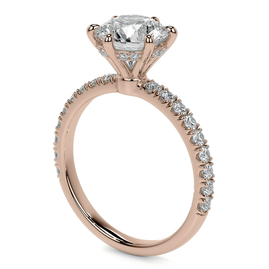 The center stone is elevated high above the band, creating a breathtaking focal point that commands attention. A delicate hidden halo of small accent stones encircle directly beneath the girdle of the center stone, adding an understated touch of sophistication.