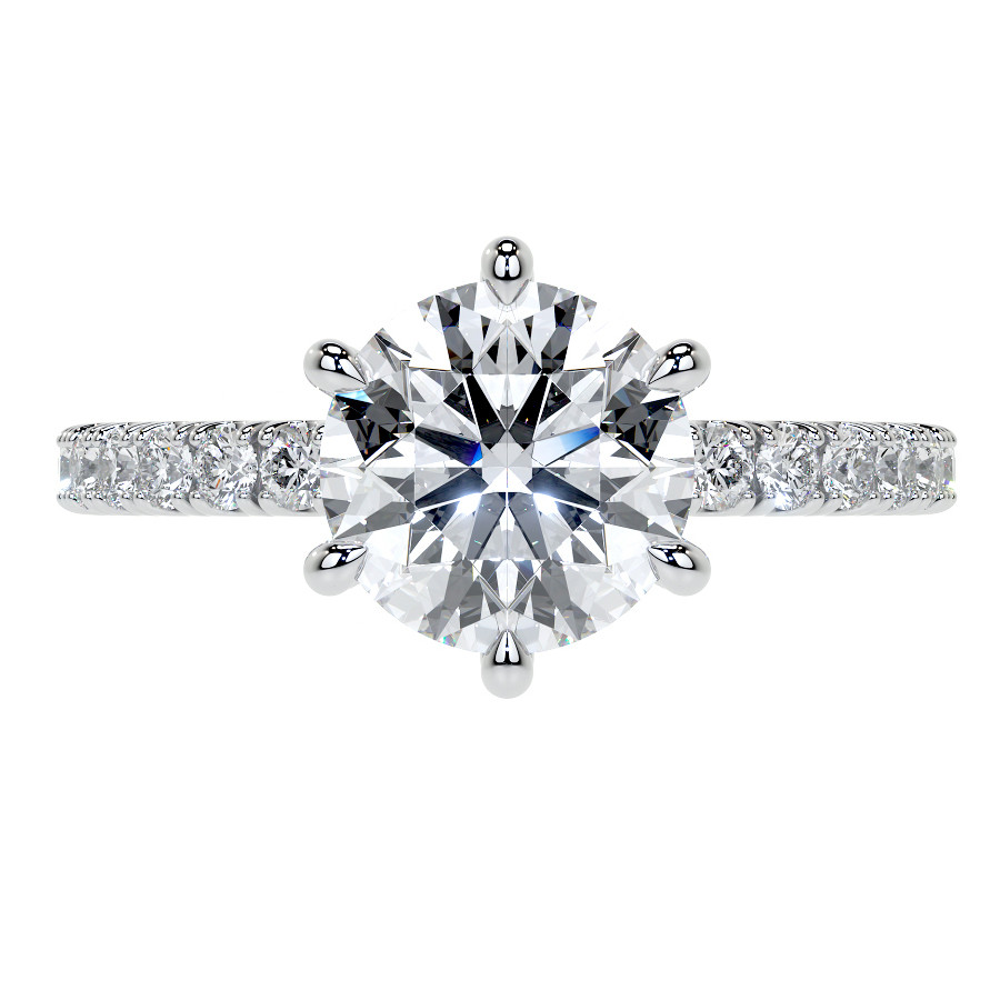 Experience pure elegance with our stunning engagement ring, featuring a round brilliant Moissanite center stone in the size and quality of your preference, held by six claw shaped prongs.