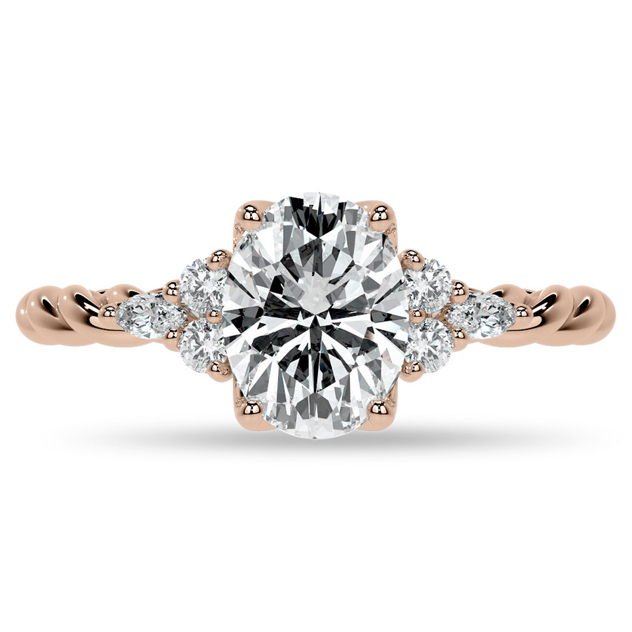 Experience the beauty of our unique engagement ring, featuring an exquisite plain band with a twisted rope design that adds a touch of artistic flair to your special moment. This stunning ring is crowned with an oval cut Moissanite center stone in the size and quality of your choosing, providing a personalized experience that perfectly captures your unique love story.