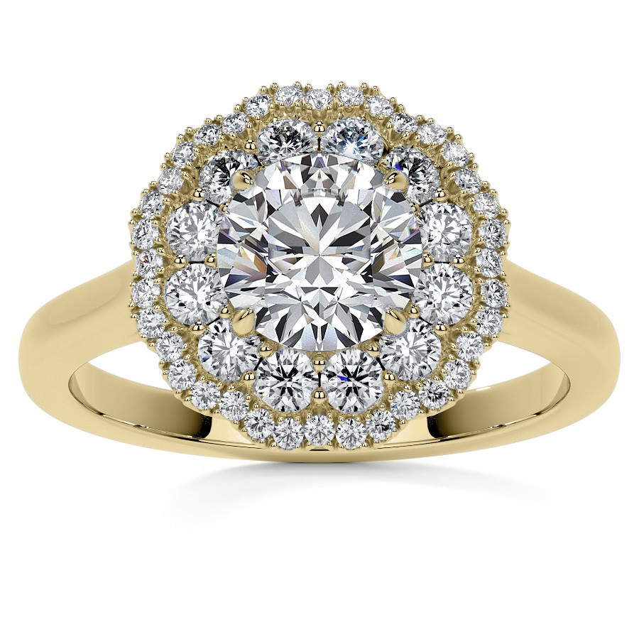 This captivating ring showcases a mesmerizing double halo design, carefully crafted to enhance the brilliance of the center stone. The larger accent stones encircle the center stone, creating a stunning first halo, while a second row of smaller accent stones forms a delicate and intricate second halo.