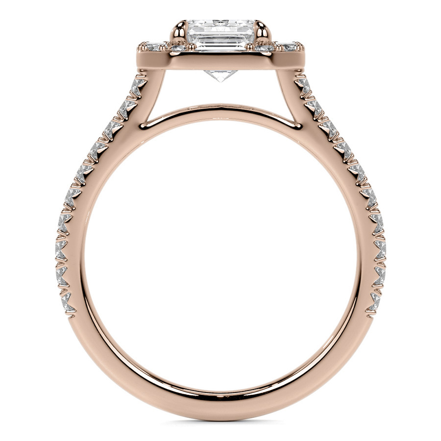 The total carat weight of the accent stones, both in the halo and along the bands, ranges between 0.10ct - 0.84ct, depending on the size of the center stone you select. This ensures that your ring captures the perfect balance of brilliance, illuminating your love with every glance.