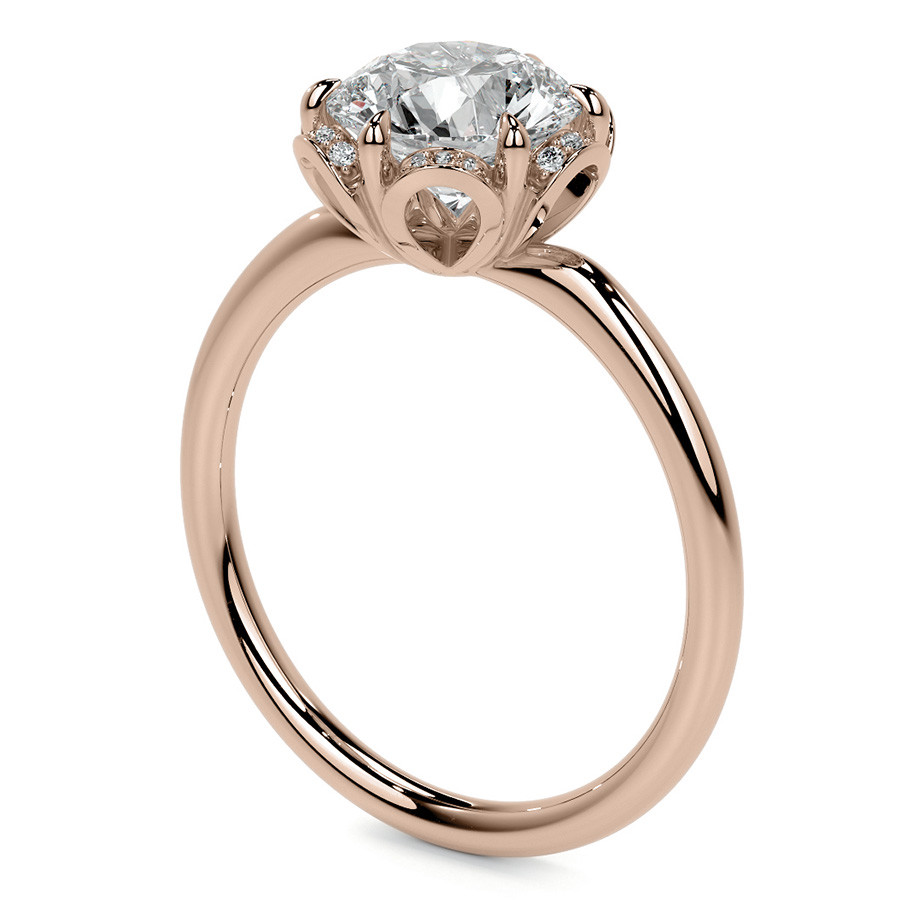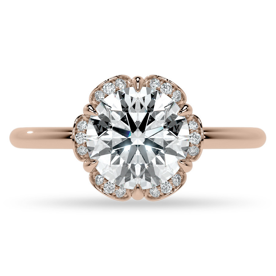 The floral halo comprises of delicate petal shapes and is adorned with round brilliant cut Moissanite accent stones that accentuate the petals' tips. You can customize the center stone to your preference in terms of size and quality.