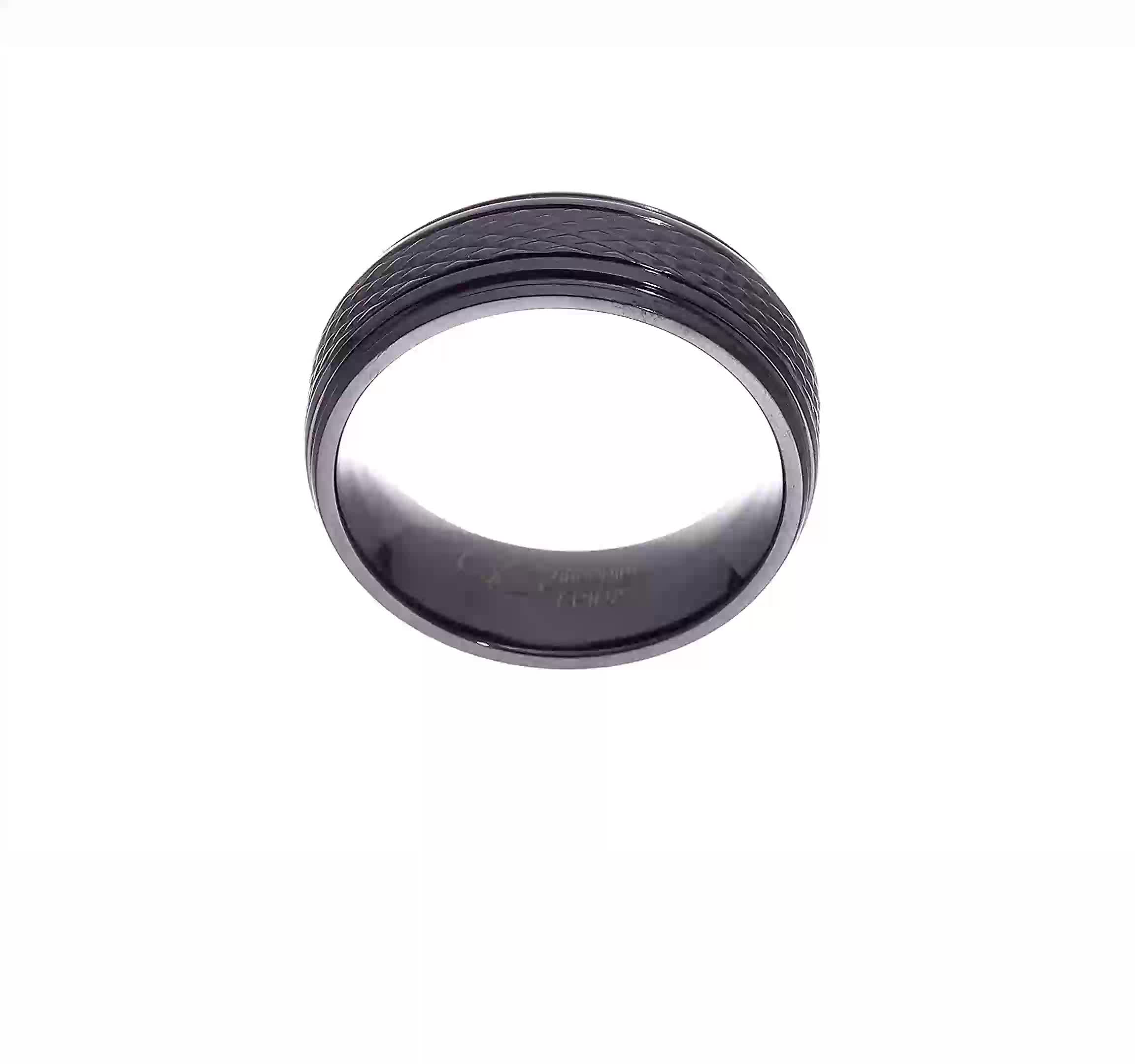 This beautiful men's plain band is cast in Black Zirconium and features a ridged edge design with a 8mm band width and high polish finish.
