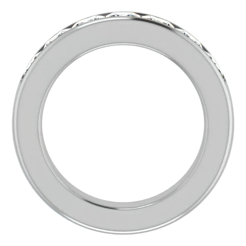 7 Channel Set 4.5mm princess cut Moissanite set in 14k gold, 18k gold or platinum. The band width at ~6mm at the base of the ring and ~6mm at its widest point.