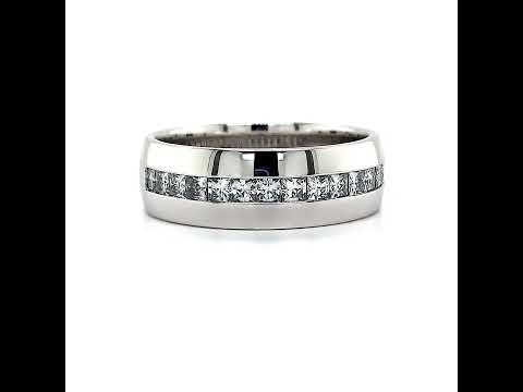 20 Channel Set 2mm Princess cut Moissanite set in 14k gold, 18k gold or platinum. The band width at ~6.8mm at the base of the ring and ~6.8mm at its widest point.