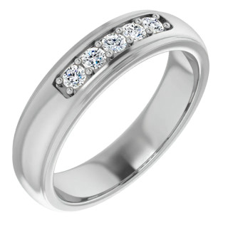 5 Prong Set 2.5mm Round brilliant cut Moissanite set in 14k gold, 18k gold or platinum. The band width at ~5.4mm at the base of the ring and ~5.4mm at its widest point.