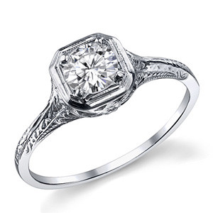 This beautiful antique reproduction filigree ring is designed with a 5.0mm/ .05 carat round brilliant cut Moissanite center stone. Available in 14k white or yellow gold.