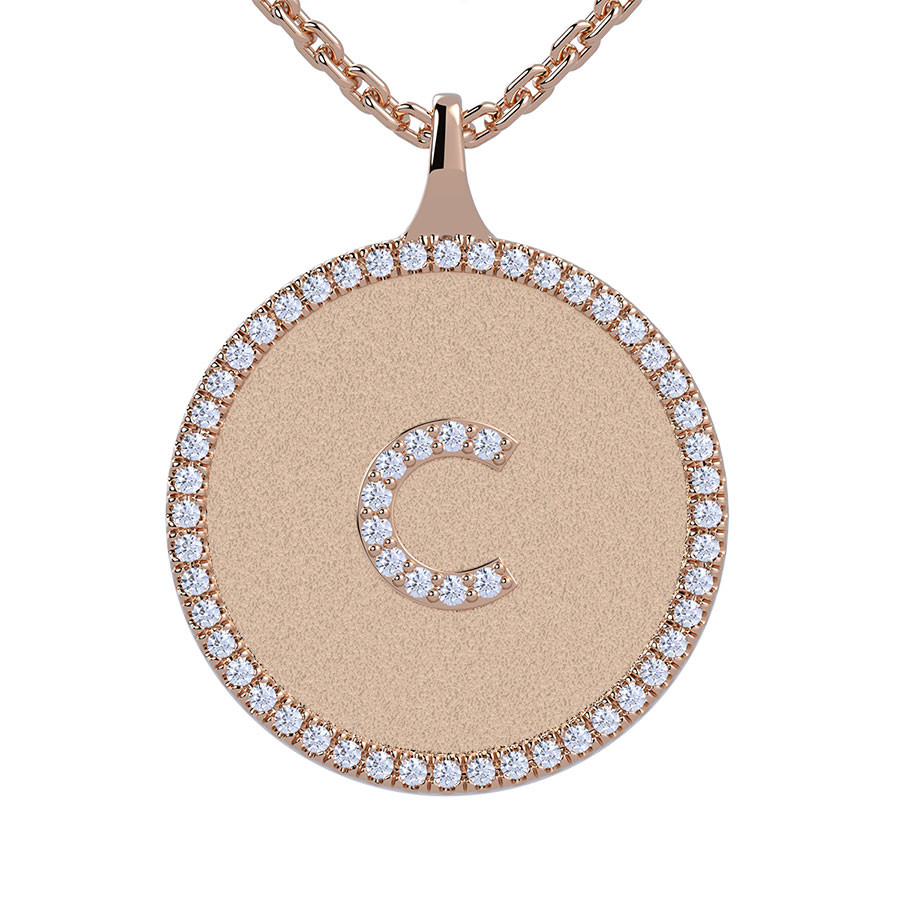 This beautiful features the letter C in a medallion design, 0.30ct of VS, E/F quality diamonds, measures 20mm in diameter, and is available in 14k gold, 18k gold and platinum. It comes with your choice of chain, or you can opt for no chain at all.