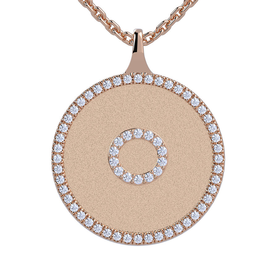 This beautiful features the letter O in a medallion design, 0.30ct of VS, E/F quality diamonds, measures 20mm in diameter, and is available in 14k gold, 18k gold and platinum. It comes with your choice of chain, or you can opt for no chain at all.