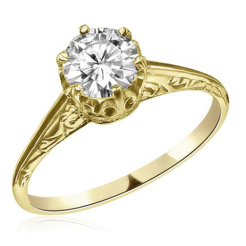 This beautiful antique reproduction filigree ring is designed with a 6.0mm/ .75 carat round brilliant cut Moissanite center stone. Available in 14k white or yellow gold.