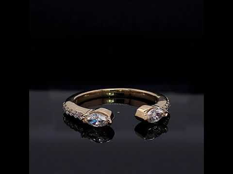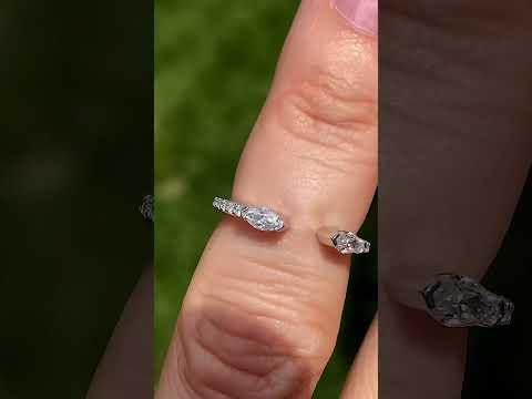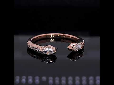 This beautiful Moissanite right hand right features an open band design with two colorless marquise cut Moissanite gemstones (5x2.5mm, 0.13ct each) and 0.12ct of round brilliant Moissanite sides stones. Available in your choice of 14k gold, 18k gold or platinum. The band measures approximately 1.8mm in width.