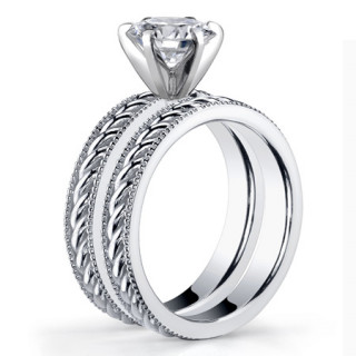 This beautiful Moissanite solitaire ring features a rope style design with milgrain accents, an optional matching band, and is cast in 14k gold, 18k gold or platinum.