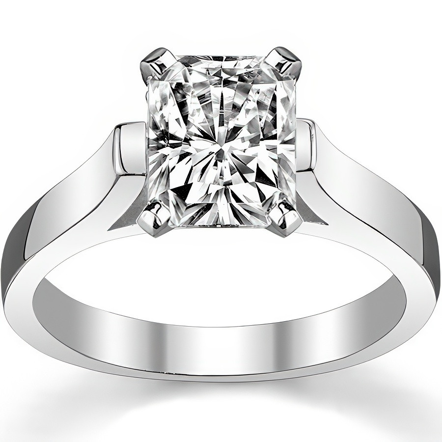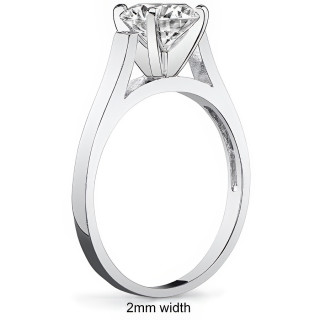 This beautiful Moissanite solitaire ring features a rounded cathedral band design, set in 14k gold, 18k gold or platinum. It is available in four different widths with an optional matching band.