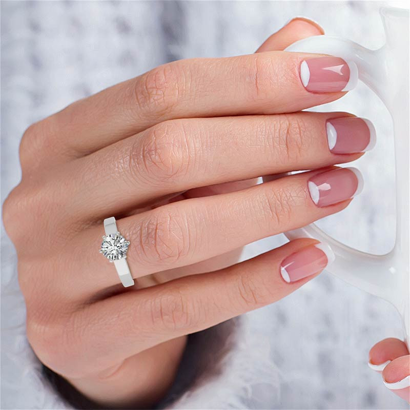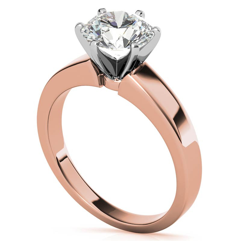 Beautiful flat shoulder Moissanite solitaire ring is available in multiple widths: 3.5mm, and 6mm. It is cast in 14k gold, 18k gold or platinum.