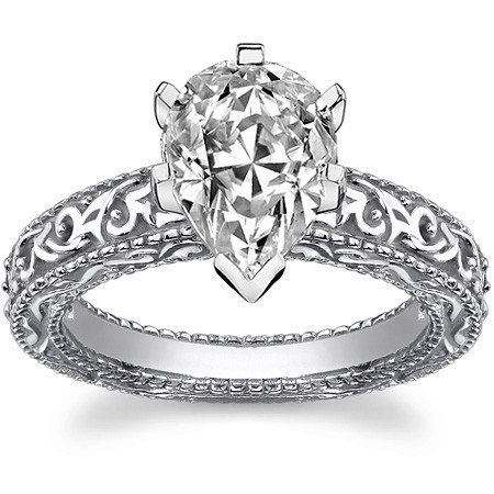 This beautiful solitaire ring features an antique inspired design, your choice of Moissanite center stone, and is available in 14k gold, 18k gold or platinum.