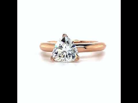 This beautiful solitaire ring features a trillion cut Moissanite center stone, an optional matching band, and is available in 14k gold, 18k gold or platinum.