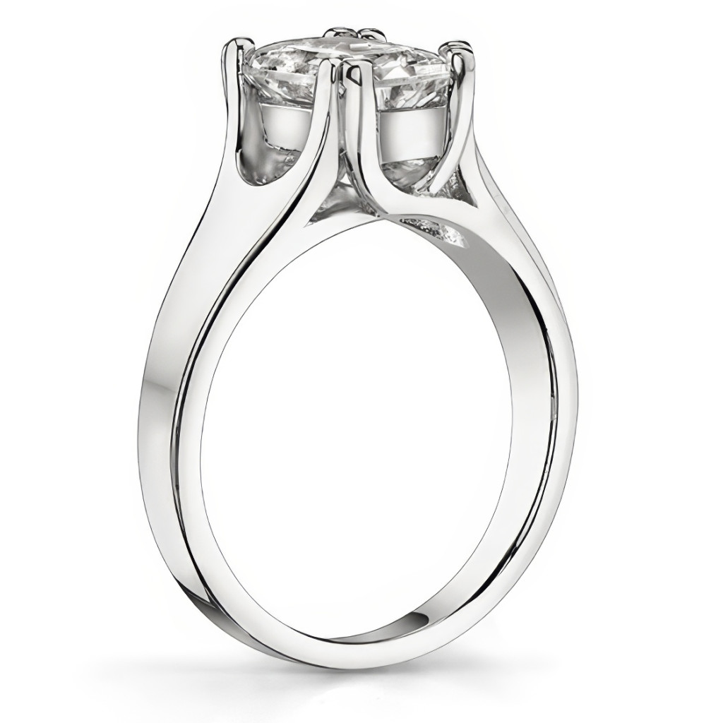 This beautiful solitaire ring features a double prong design with a radiant or emerald cut Moissanite center stone, set in 14k gold, 18k gold or platinum.