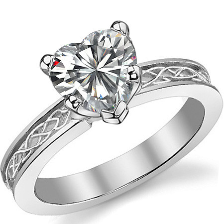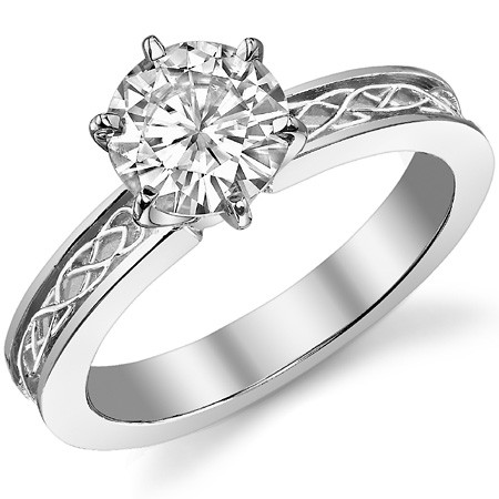 This beautiful Moissanite solitaire features a gorgeous Celtic knot style design, your choice of Moissanite size and shape center stone, in 14k gold, 18k gold or platinum with an optional matching band.