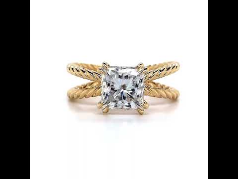 This Moissanite solitaire ring features beautiful a designer inspired design with a split shank and woven rope style bands, optional double prongs for the center stone, and is set in 14k gold, 18k gold or platinum.