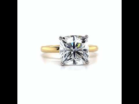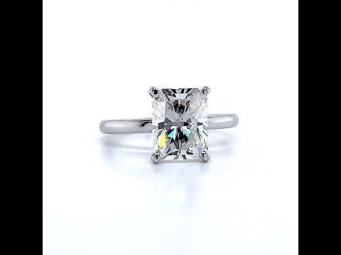 This beautiful Moissanite solitaire ring features a simple but classic 2mm band width design, an option 2mm wide matching band, your choice of Moissanite size / shape center stone, and is available in 14k gold, 18k gold or platinum. Additional videos are available with a 4 prong and v-prong center stone.