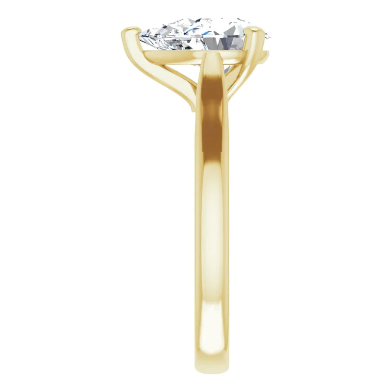 This solitaire ring features a cathedral design, a pear cut colorless Moissanite center stone, and is cast in 14k gold, 18k gold or platinum.