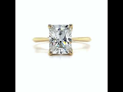 This solitaire ring features a cathedral design with beautiful prongs, your choice of an emerald or radiant cut colorless Moissanite center stone, and is cast in 14k gold, 18k gold or platinum. Add an optional matching band to make this a wedding set.