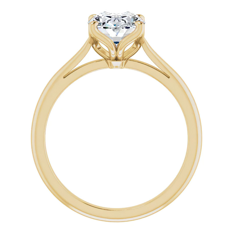This solitaire ring features a cathedral design with beautiful prongs, an Oval cut colorless Moissanite center stone, and is cast in 14k gold, 18k gold or platinum. Add an optional matching band to make this a wedding set.
