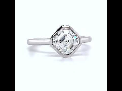 This solitaire ring features an Asscher cut Moissanite center stone bezel set North-East-South-West in your choice of 14k gold, 18k gold or platinum. The band width measures 1.9mm at the base.