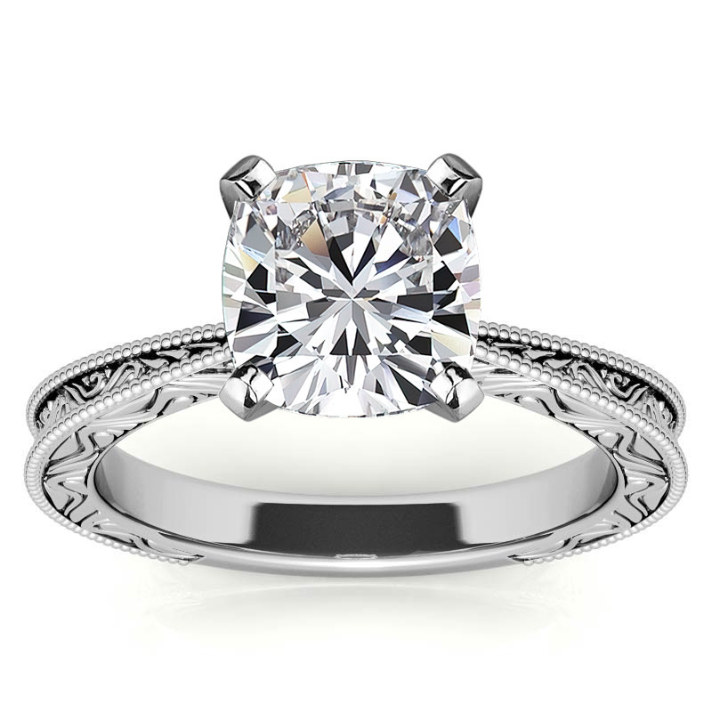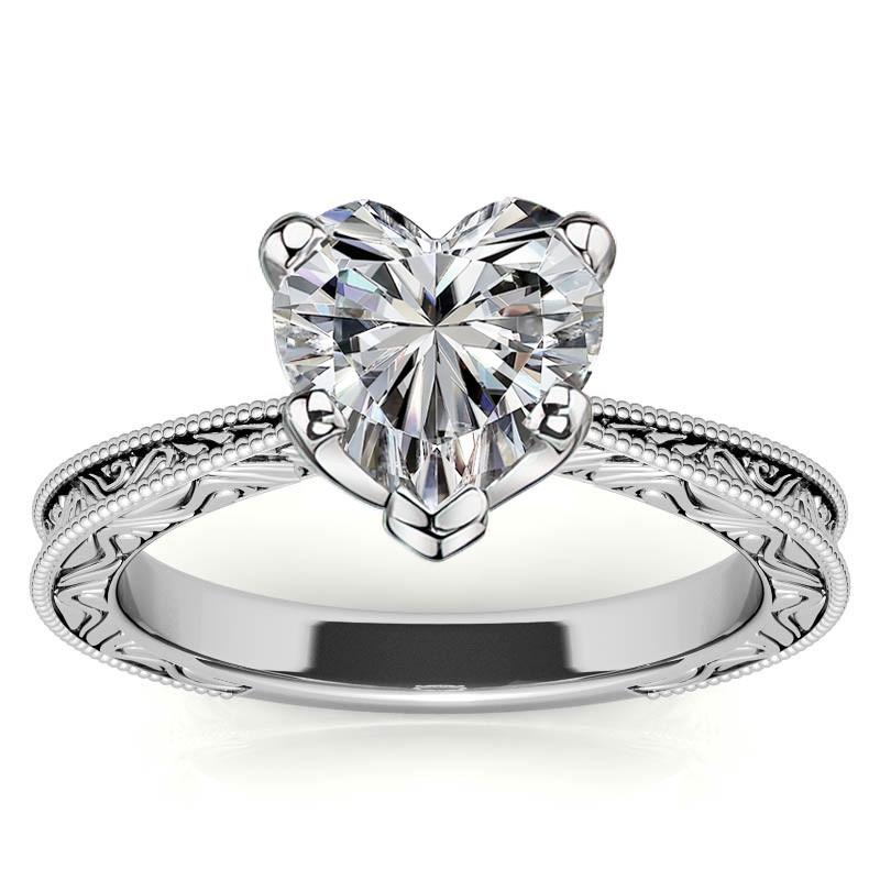 #sol467 Engraved Moissanite Solitaire Ring with Milgrain