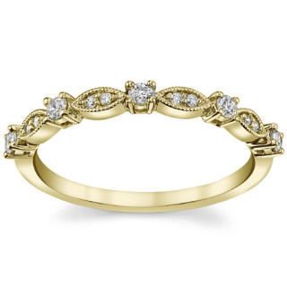 This beautiful stackable wedding band features an antique inspired design, milgrain accents and 0.20ct of round brilliant Moissanite side stones, set in 14k gold, 18k gold or platinum.