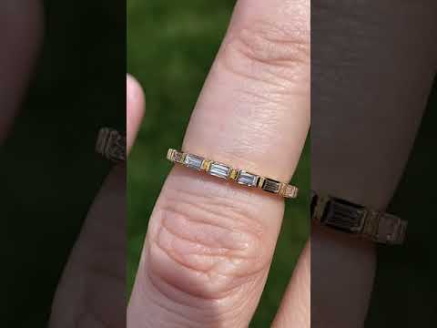 This beautiful stackable wedding band features 0.34ct of baguette cut Moissanite or lab grown diamond stones, and is cast in solid 14k gold, 18k gold or platinum.