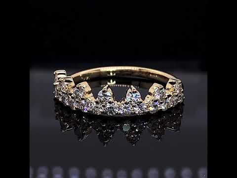 This beautiful stackable band features a shared-prong crown design, 0.63tcw of round brilliant Moissanite side stones, and is set in 14k gold.