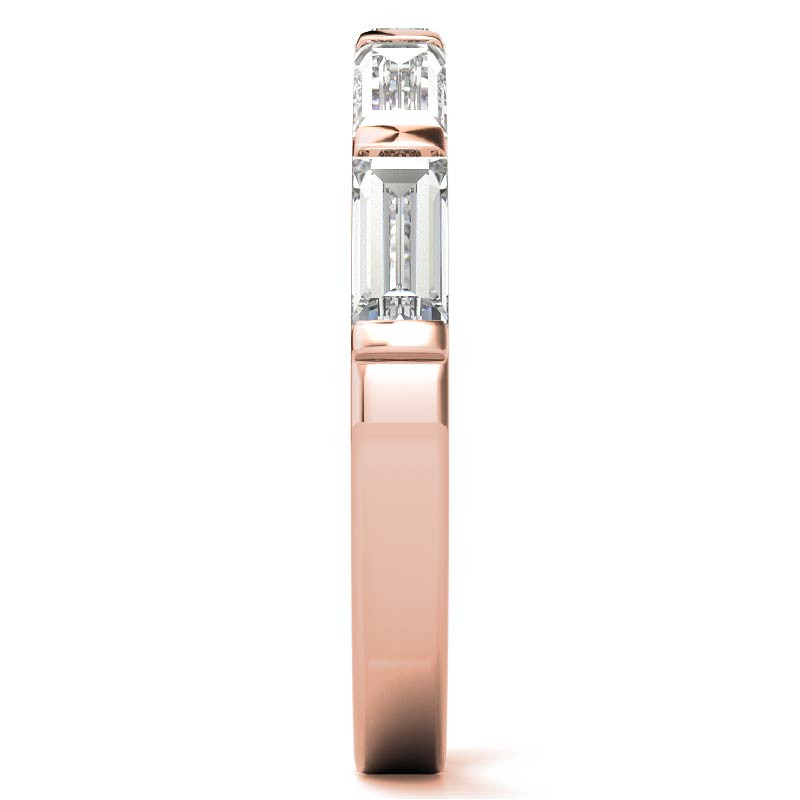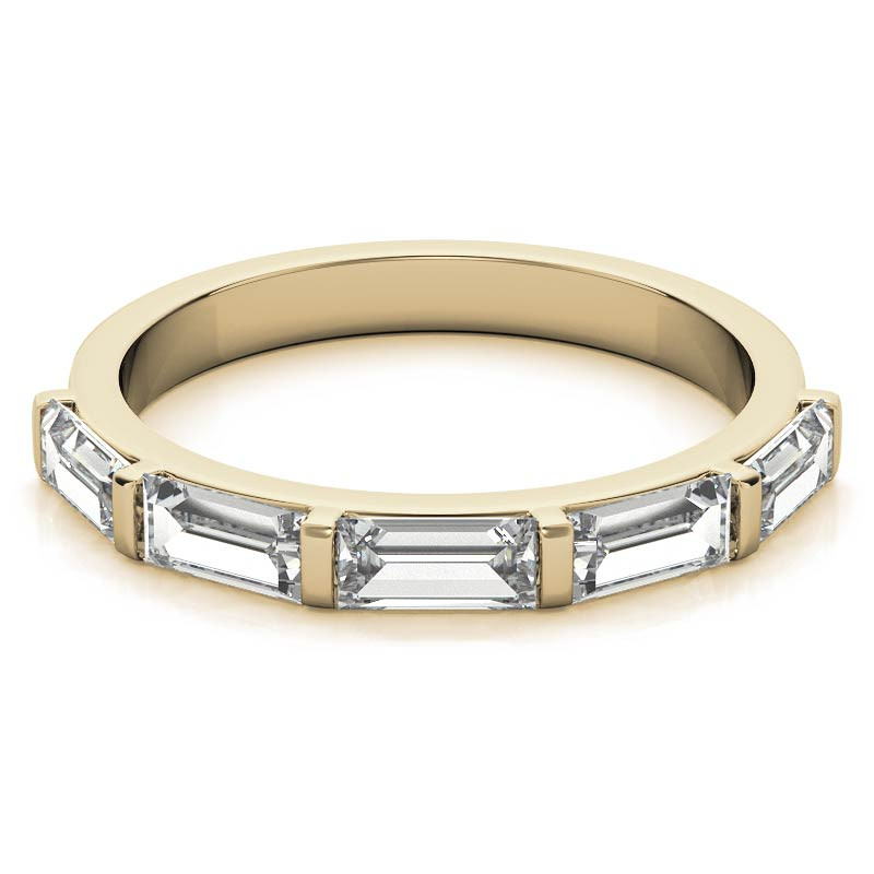 This stackable anniversary band has five 5mm x 2.5mm baguette Moissanite stones (1.05tcw). Set in your choice of 14k gold, 18k gold or platinum. The band measures 2.5mm wide and about 2.2mm high.