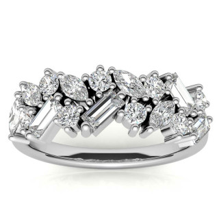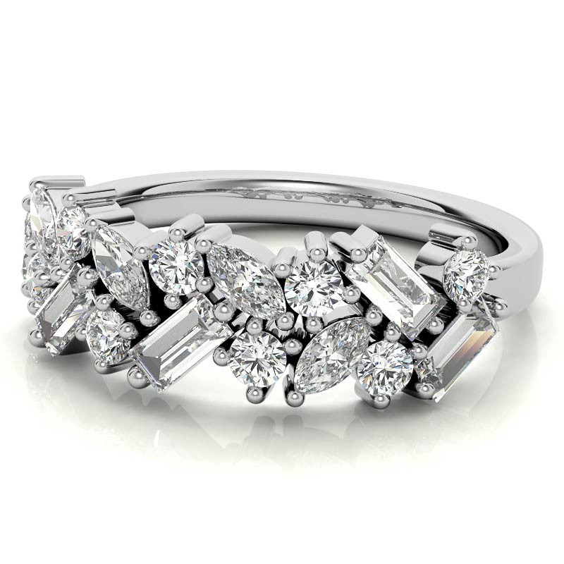 This beautiful Moissanite stackable band features 1.11tcw of round brilliant, marquise, and baguette-cut Moissanite gemstones, set in 14k or 18k gold.