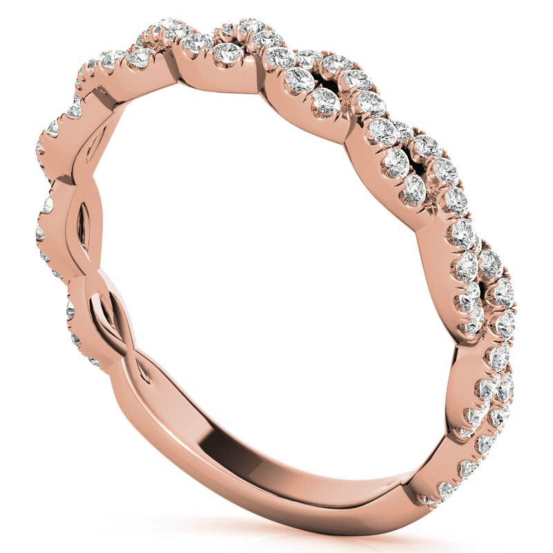 This beautiful Moissanite stackable band features a twisted infinity design with 0.37ct of colorless Moissanite side stones, cast in your choice of 14k gold, 18k gold or platinum. The band width is approximately 3.0mm. The height is approximately 2mm.
